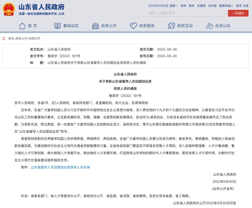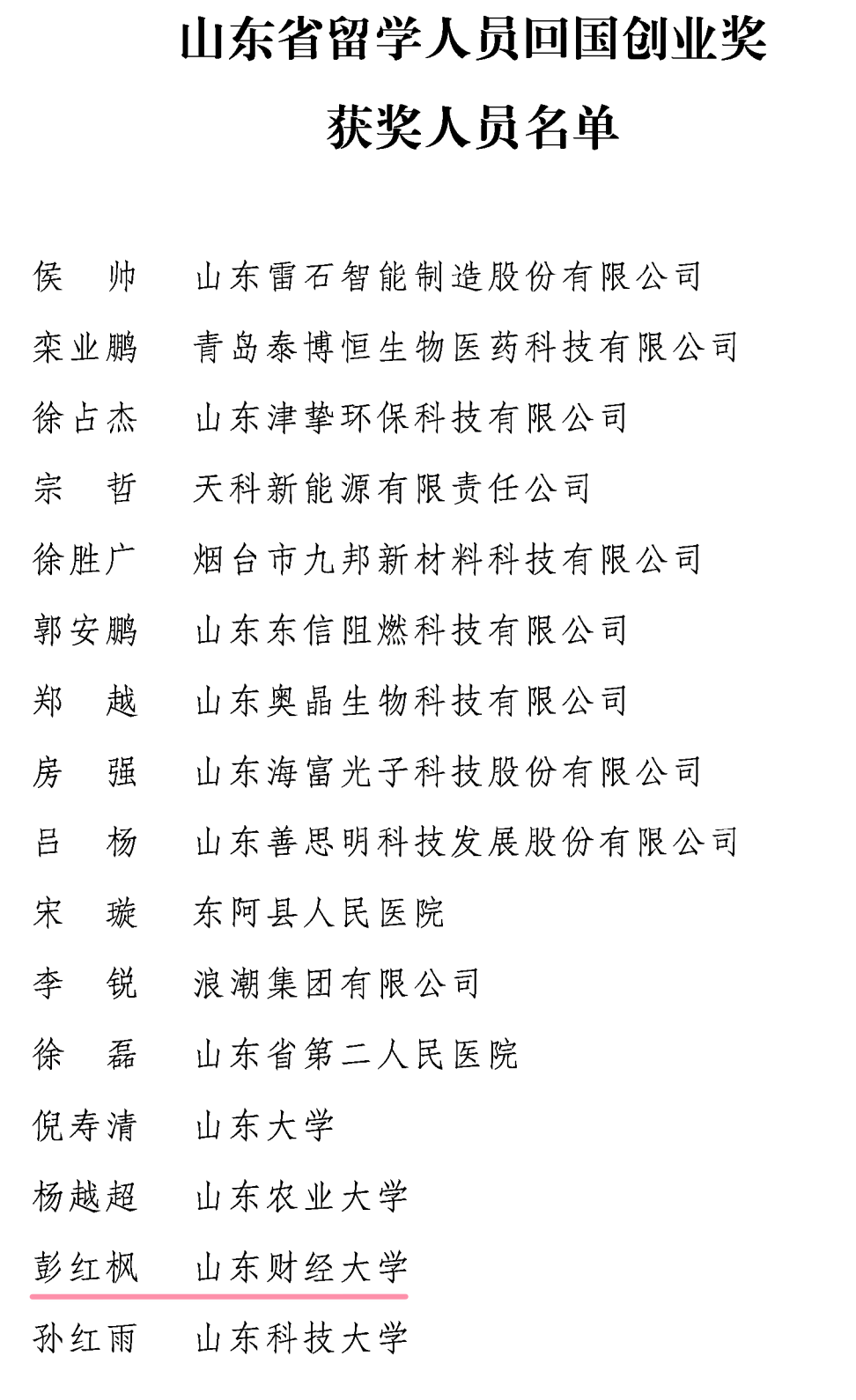 近日,山东省人民政府下发文件《关于表彰山东省留学人员回国创业奖获奖人员的通报》(鲁政字〔2022〕197号),授予我校金融学院院长、欧美同学会副会长彭红枫教授等20名优秀回国人员“山东省留学人员回国创业奖”荣誉称号。