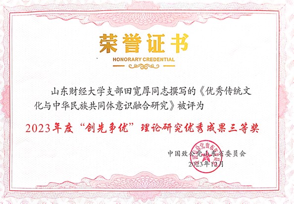 2023年以来,致公党山东财经大学基层委员会在党派省委和学校党委的领导下,在认真完成教学科研、管理服务等本职工作的同时,始终紧紧围绕省委会会议部署要求,坚持聚焦“有效需求、数字经济、乡村振兴、区域协调、绿色低碳、民生福祉、安全发展”,发挥专业优势,深入调查研究,积极建言献策,撰写了多篇建议及研究报告,其中,2篇分别被致公党省委会采用后,报送省政协、省委统战部和致公党中央;1篇经致公党省委会报送后,被省政协采用;1篇获理论研究优秀成果三等奖。