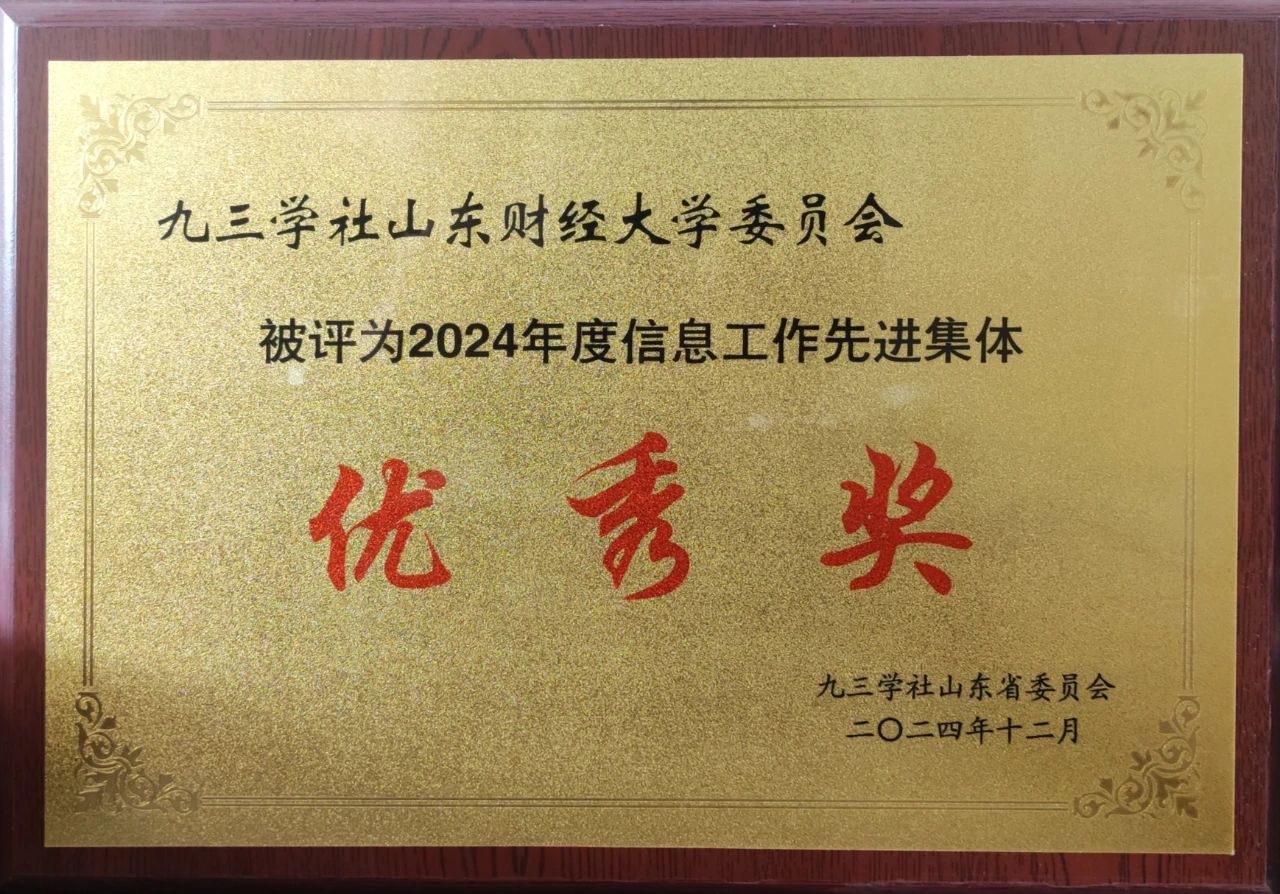 近日,九三学社山东省委八届六次全会在济南召开,会议表彰了2024年度全省社务工作先进集体和先进个人,九三学社山东财经大学委员会荣获5项表彰,包括集体奖2项,单项奖3项。九三学社山东财经大学委员会荣获九三学社山东省2024年度优秀基层组织(全省2所高校),九三学社山东省委员会2024年度信息工作先进集体优秀奖(全省5所高校);委员会主委邢楠楠教授荣获九三学社山东省2024年度“参政议政工作先进个人”,九三学社山东省2023-2024年度“社会服务工作先进个人”,九三学社山东省2024年度信息工作先进个人。