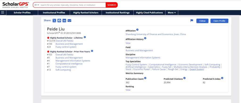 日,国际学术排名机构ScholarGPS发布了2024年全球前0.05%顶尖科学家榜单(Highly Ranked Scholars),榜单分为“终身”(Highly Ranked Scholar - Lifetime)和“近五年”(Highly Ranked Scholar - Prior 5 Years)两个类别,中国内地有286位学者入选“终身”榜单、1600位学者入选“近5年”榜单。山东财经大学刘培德教授凭借突出的学术成就和广泛的国际影响力,成功入选“终身”榜单和“近5年”榜单。其中,在模糊控制系统专业“终身”榜单中,全球排名第24位;在计算智能专业“近5年”榜单中,跻身全球前列。