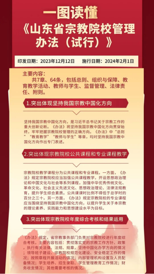 近日,山东省民族宗教委公布了《山东省宗教院校管理办法(试行)》(以下简称《办法》),将于2024年2月1日起施行。
