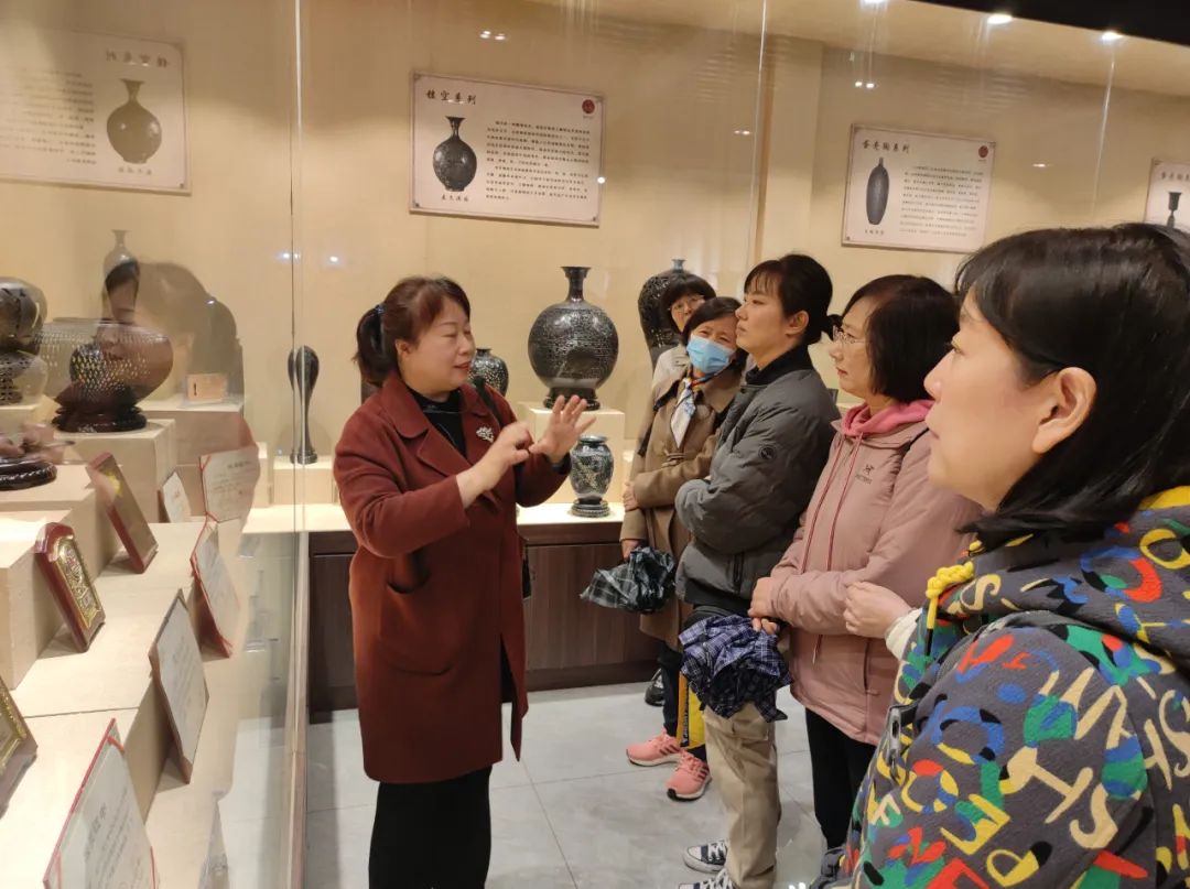 在中国龙山黑陶研发中心,调研团跟随中国黑陶非物质文化遗产传承人刘德功先生,共同欣赏黑陶艺术珍品,学习了解龙山黑陶9000年的烧制发展历史,并参观了黑陶作品的现场制作过程,与工作人员就龙山黑陶文化的传承与发展进行交流与讨论。